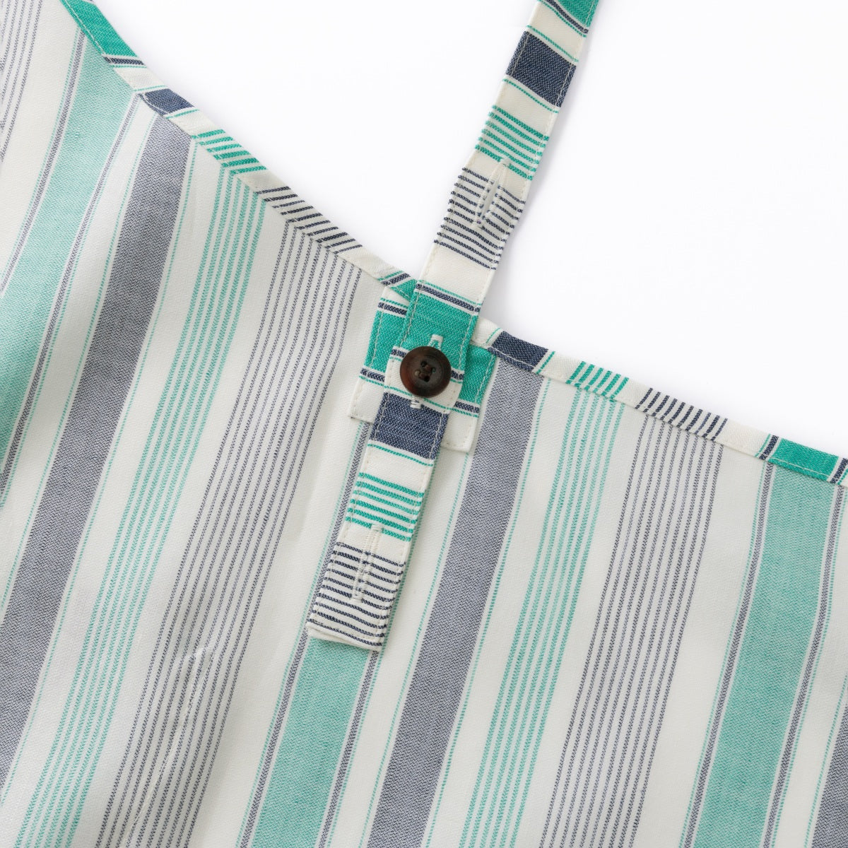 共布で作った肩ひもには、長さ調整のボタンホールが3つ。